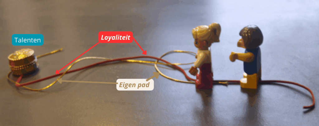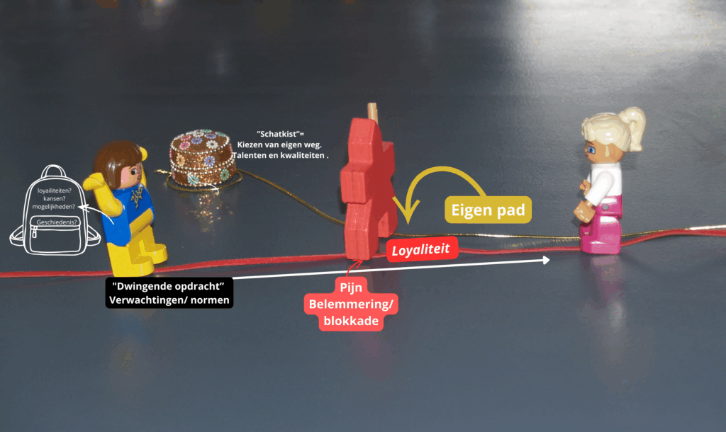 De ouder (bij ouder(s), lees ook verzorger(s)) staat als een steun in de rug van deze dochter. Er is ruimte voor zelf ontwikkeling. Door loyaliteit (het rode draadje ) zijn ze met elkaar verbonden. Die loyaliteit slingert mee in het proces waarin de dochter haar eigen weg zoekt. Onderweg met haar talenten, kwaliteiten en ervaringen die in haar “schatkist” zitten.