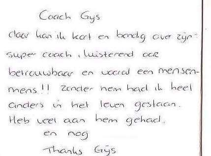 Vrouw 29 jaar : “Vorig jaar heb ik een traject gevolgd bij Coach Gijs. Vrij spontaan kwam ik zijn contactgegevens in de krant tegen en ik ben maar gewoon contact gaan opnemen. Ik werd direct ontzettend warm en gemoedelijk ontvangen en we besloten na een telefoongesprek om elkaar eens te ontmoeten. Ik kreeg na de eerste sessie, waarin we samen een plan maakten, de tijd om rustig na te denken of ik het echt wilde. Ontzettend fijn om deze ruimte te krijgen! Ik ben ervoor gegaan en ben tot op de dag van vandaag dankbaar. Ik heb er namelijk heel veel aan gehad. Coach Gijs luistert naar je, is empathisch maar ook professioneel. Hij beheerst zijn kennis en met deze kennis heeft hij me geholpen met het vinden van oplossingen. Daardoor sta ik nu heel anders in het leven en voel ik me een stuk beter. Ook is de prijs/kwaliteit verhouding uitstekend. Dank je wel voor je hulp, toewijding en stiekem ook voor de gezelligheid tussendoor.”